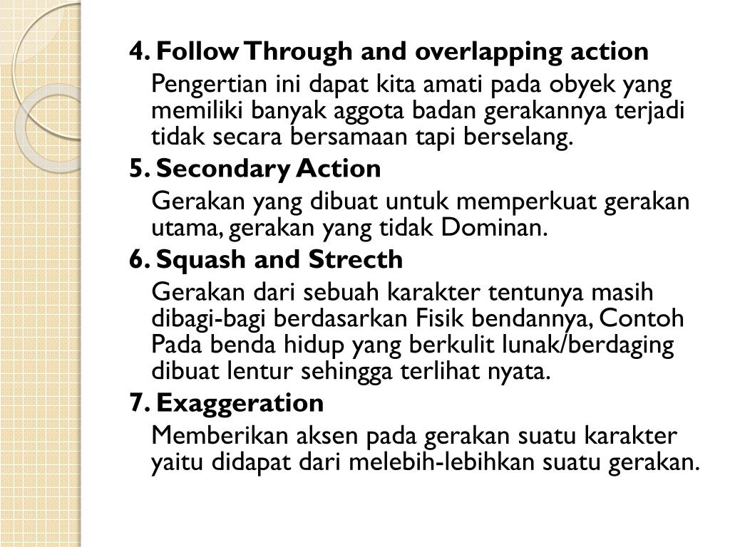 4. Follow Through and overlapping action Pengertianinidapatkitaamatipadaobyek yang memilikibanyakaggotabadangerakannyaterjaditidaksecarabersamaantapiberselang. 5. Secondary Action Gerakan yang dibuatuntukmemperkuatgerakanutama, gerakan yang tidakDominan. 6. Squash and Strecth Gerakandarisebuahkaraktertentunyamasihdibagi-bagiberdasarkanFisikbendannya, ContohPadabendahidup yang berkulitlunak/berdagingdibuatlentursehinggaterlihatnyata. 7. Exaggeration Memberikanaksenpadagerakansuatukarakteryaitudidapatdarimelebih-lebihkansuatugerakan.