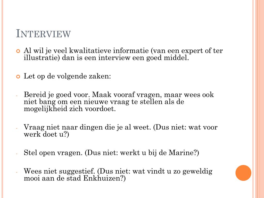Interview • Al wil je veel kwalitatieve informatie (van een expert of ter illustratie) dan is een interview een goed middel. • Let op de volgende zaken: • Bereid je goed voor. Maak vooraf vragen, maar wees ook niet bang om een nieuwe vraag te stellen als de mogelijkheid zich voordoet. • Vraag niet naar dingen die je al weet. (Dus niet: wat voor werk doet u?) • Stel open vragen. (Dus niet: werkt u bij de Marine?) • Wees niet suggestief. (Dus niet: wat vindt u zo geweldig mooi aan de stad Enkhuizen?)