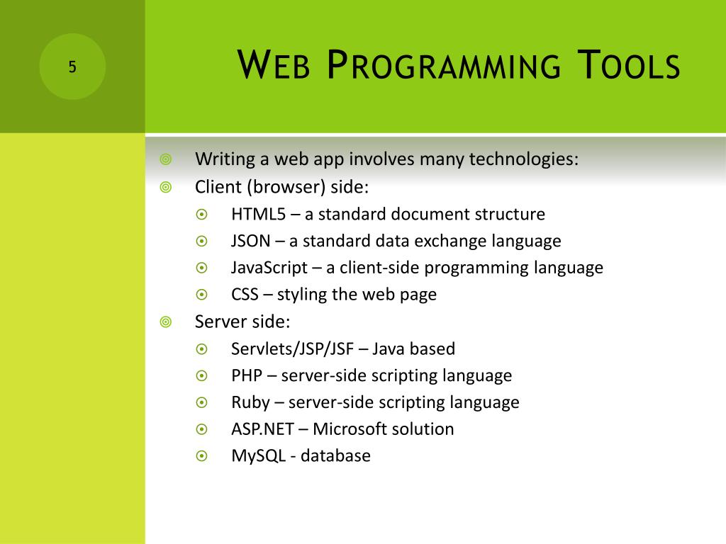 Web Programming Tools • Writing a web app involves many technologies: • Client (browser) side: • HTML5 – a standard document structure • JSON – a standard data exchange language • JavaScript – a client-side programming language • CSS – styling the web page • Server side: • Servlets/JSP/JSF – Java based • PHP – server-side scripting language • Ruby – server-side scripting language • ASP.NET – Microsoft solution • MySQL - database