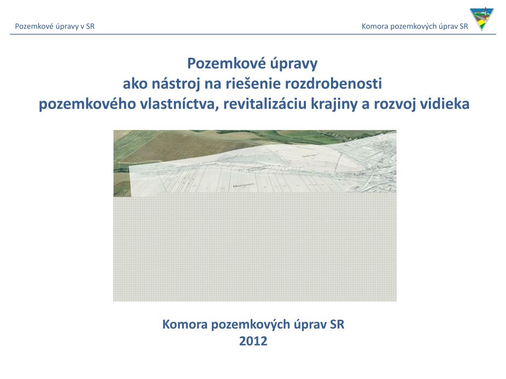 Pozemkové úpravy v SR. Komora pozemkových úprav SR. Pozemkové úpravy ako nástroj na riešenie rozdrobenosti pozemkového vlastníctva, revitalizáciu krajiny a rozvoj vidieka. Komora pozemkových úprav SR 2012. Pozemkové úpravy v SR. Komora pozemkových úprav SR.