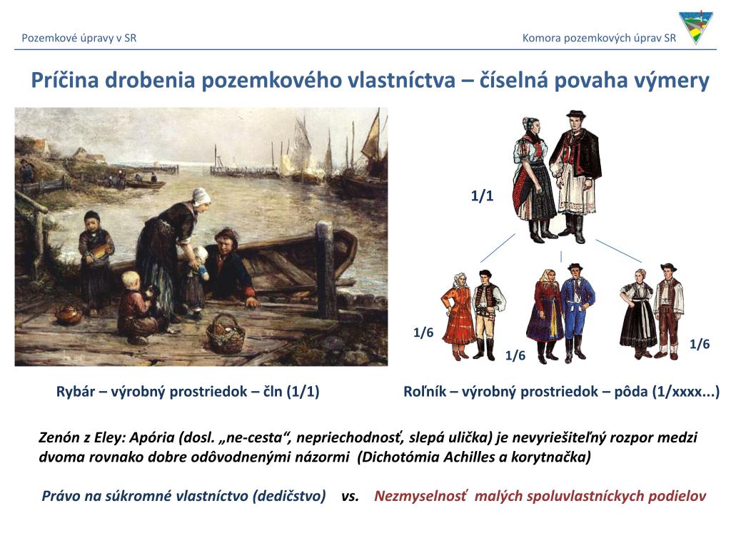 Pozemkové úpravy v SR Komora pozemkových úprav SR Príčina drobenia pozemkového vlastníctva – číselná povaha výmery 1/1 1/6 1/6 1/6 Rybár – výrobný prostriedok – čln (1/1) Roľník – výrobný prostriedok – pôda (1/xxxx...) Zenón z Eley: Apória (dosl. „ne-cesta“, nepriechodnosť, slepá ulička) je nevyriešiteľný rozpor medzi dvoma rovnako dobre odôvodnenými názormi (Dichotómia Achilles a korytnačka) Právo na súkromné vlastníctvo (dedičstvo)vs. Nezmyselnosť malých spoluvlastníckych podielov