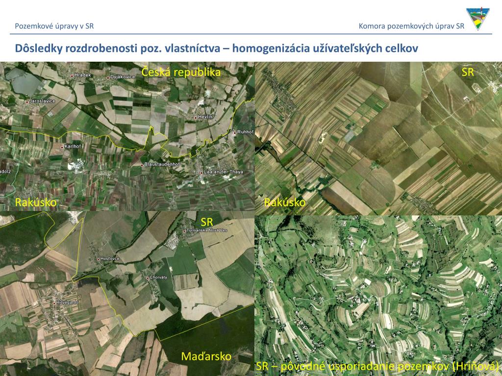 Pozemkové úpravy v SR Komora pozemkových úprav SR Dôsledky rozdrobenosti poz. vlastníctva – homogenizácia užívateľských celkov Česká republika SR Rakúsko Rakúsko SR Maďarsko SR – pôvodné usporiadanie pozemkov (Hriňová)