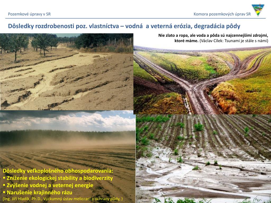 Pozemkové úpravy v SR Komora pozemkových úprav SR Dôsledky rozdrobenosti poz. vlastníctva – vodná a veterná erózia, degradácia pôdy Nie zlato a ropa, ale voda a pôda sú najcennejšími zdrojmi, ktoré máme. (Václav Cílek: Tsunami je stále s námi) • Dôsledky veľkoplošného obhospodarovania: • Zníženie ekologickej stability a biodiverzity • Zvýšenie vodnej a veternej energie • Narušenie krajinného rázu • (Ing. Jiří Hladík, Ph.D., Výzkumný ústav meliorací a ochrany půdy, )