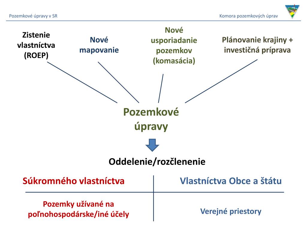 Pozemkové úpravy v SR Komora pozemkových úprav Nové usporiadanie pozemkov (komasácia) Zistenie vlastníctva (ROEP) Nové mapovanie Plánovanie krajiny + investičná príprava Pozemkové úpravy Oddelenie/rozčlenenie Súkromného vlastníctva Vlastníctva Obce a štátu Pozemky užívané na poľnohospodárske/iné účely Verejné priestory