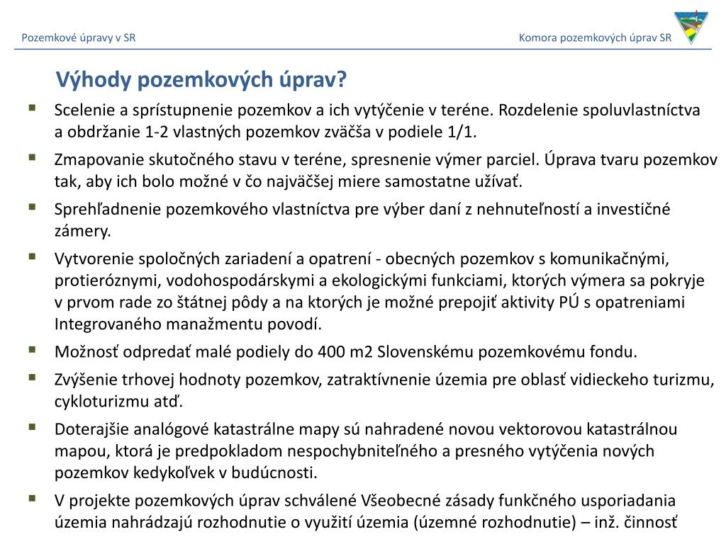 Pozemkové úpravy v SR Komora pozemkových úprav SR Výhody pozemkových úprav? • Scelenie a sprístupnenie pozemkov a ich vytýčenie v teréne. Rozdelenie spoluvlastníctva a obdržanie 1-2 vlastných pozemkov zväčša v podiele 1/1. • Zmapovanie skutočného stavu v teréne, spresnenie výmer parciel. Úprava tvaru pozemkov tak, aby ich bolo možné v čo najväčšej miere samostatne užívať. • Sprehľadnenie pozemkového vlastníctva pre výber daní z nehnuteľností a investičné zámery. • Vytvorenie spoločných zariadení a opatrení - obecných pozemkov s komunikačnými, protieróznymi, vodohospodárskymi a ekologickými funkciami, ktorých výmera sa pokryje v prvom rade zo štátnej pôdy a na ktorých je možné prepojiť aktivity PÚ s opatreniami Integrovaného manažmentu povodí. • Možnosť odpredať malé podiely do 400 m2 Slovenskému pozemkovému fondu. • Zvýšenie trhovej hodnoty pozemkov, zatraktívnenie územia pre oblasť vidieckeho turizmu, cykloturizmu atď. • Doterajšie analógové katastrálne mapy sú nahradené novou vektorovou katastrálnou mapou, ktorá je predpokladom nespochybniteľného a presného vytýčenia nových pozemkov kedykoľvek v budúcnosti. • V projekte pozemkových úprav schválené Všeobecné zásady funkčného usporiadania územia nahrádzajú rozhodnutie o využití územia (územné rozhodnutie) – inž. činnosť