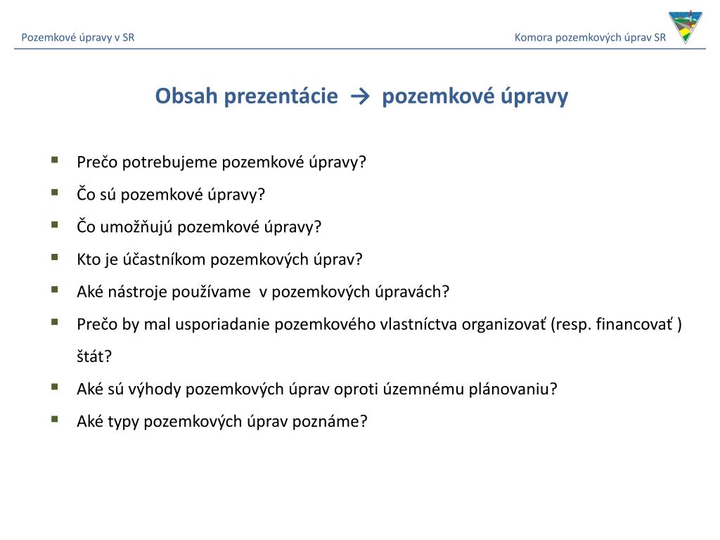 Pozemkové úpravy v SR Komora pozemkových úprav SR Obsah prezentácie → pozemkové úpravy • Prečo potrebujeme pozemkové úpravy? • Čo sú pozemkové úpravy? • Čo umožňujú pozemkové úpravy? • Kto je účastníkom pozemkových úprav? • Aké nástroje používame v pozemkových úpravách? • Prečo by mal usporiadanie pozemkového vlastníctva organizovať (resp. financovať ) štát? • Aké sú výhody pozemkových úprav oproti územnému plánovaniu? • Aké typy pozemkových úprav poznáme?