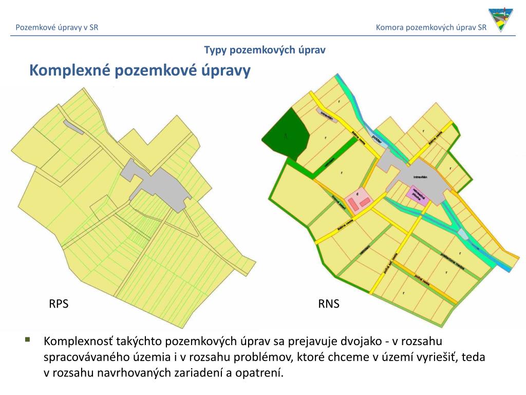 Pozemkové úpravy v SR Komora pozemkových úprav SR Typy pozemkových úprav Komplexné pozemkové úpravy RPS RNS • Komplexnosť takýchto pozemkových úprav sa prejavuje dvojako - v rozsahu spracovávaného územia i v rozsahu problémov, ktoré chceme v území vyriešiť, teda v rozsahu navrhovaných zariadení a opatrení.