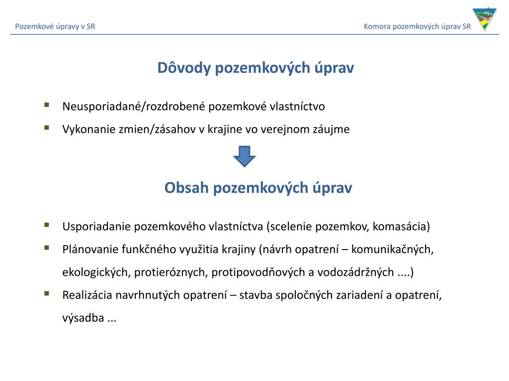 Pozemkové úpravy v SR Komora pozemkových úprav SR Dôvody pozemkových úprav • Neusporiadané/rozdrobené pozemkové vlastníctvo • Vykonanie zmien/zásahov v krajine vo verejnom záujme Obsah pozemkových úprav • Usporiadanie pozemkového vlastníctva (scelenie pozemkov, komasácia) • Plánovanie funkčného využitia krajiny (návrh opatrení – komunikačných, ekologických, protieróznych, protipovodňových a vodozádržných ....) • Realizácia navrhnutých opatrení – stavba spoločných zariadení a opatrení, výsadba ...