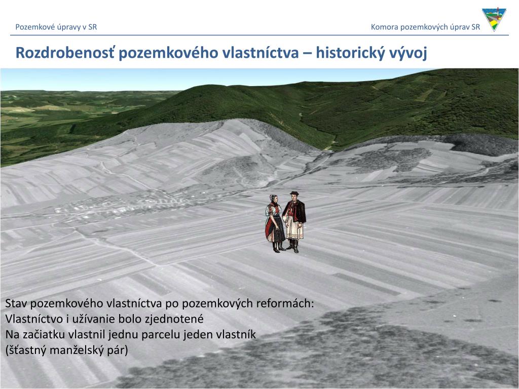 Pozemkové úpravy v SR Komora pozemkových úprav SR Rozdrobenosť pozemkového vlastníctva – historický vývoj Stav pozemkového vlastníctva po pozemkových reformách: Vlastníctvo i užívanie bolo zjednotené Na začiatku vlastnil jednu parcelu jeden vlastník (šťastný manželský pár)
