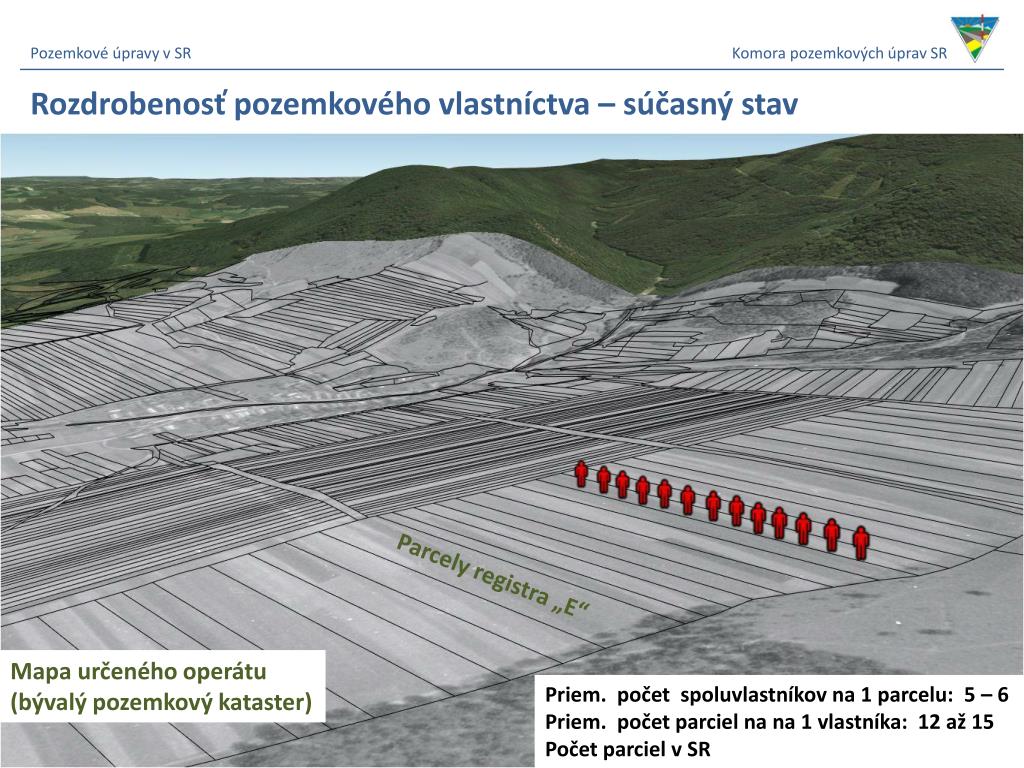 Pozemkové úpravy v SR Komora pozemkových úprav SR Rozdrobenosť pozemkového vlastníctva – súčasný stav Parcely registra „E“ Mapa určeného operátu (bývalý pozemkový kataster) Priem. počet spoluvlastníkov na 1 parcelu: 5 – 6 Priem. počet parciel na na 1 vlastníka: 12 až 15 Počet parciel v SR