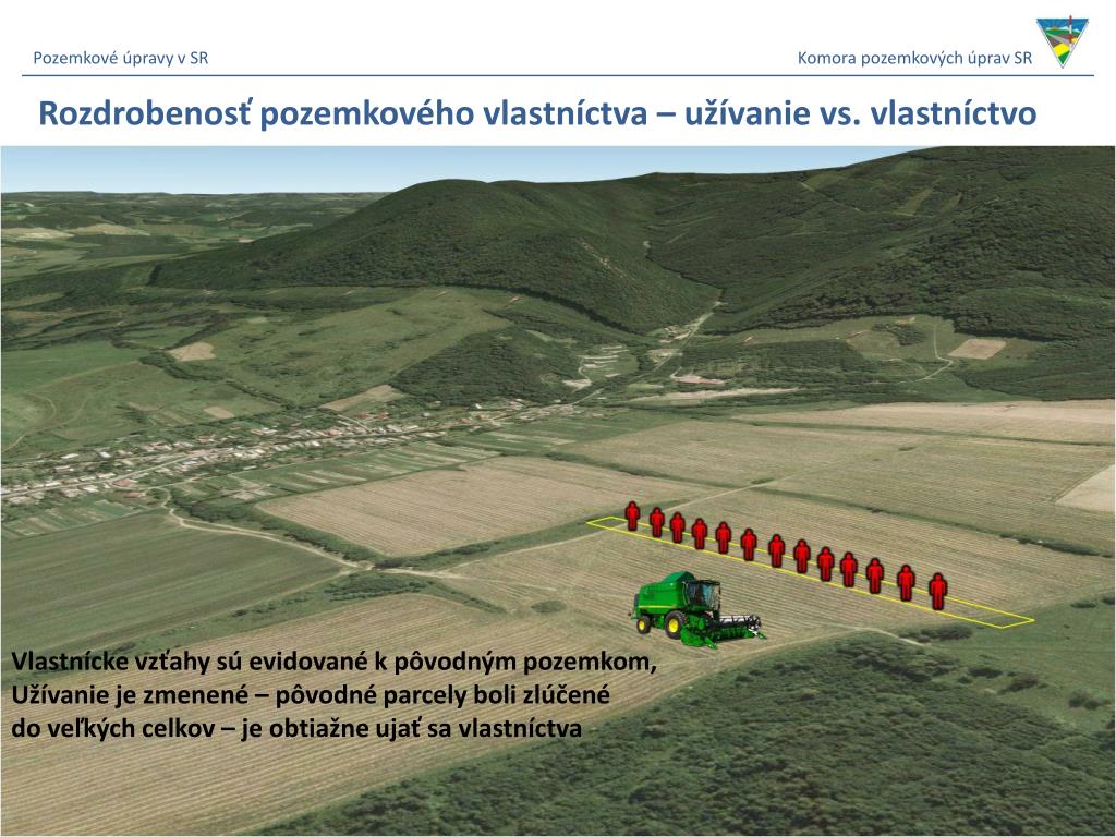 Pozemkové úpravy v SR Komora pozemkových úprav SR Rozdrobenosť pozemkového vlastníctva – užívanie vs. vlastníctvo Vlastnícke vzťahy sú evidované k pôvodným pozemkom, Užívanie je zmenené – pôvodné parcely boli zlúčené do veľkých celkov – je obtiažne ujať sa vlastníctva