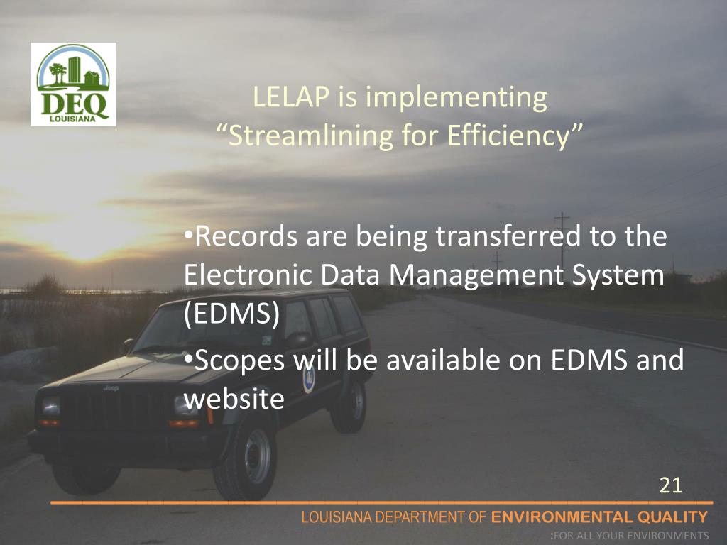 LELAP is implementing “Streamlining for Efficiency” Records are being transferred to the Electronic Data Management System (EDMS) Scopes will be available on EDMS and website _________________________________________ LOUISIANA DEPARTMENT OF ENVIRONMENTAL QUALITY :FOR ALL YOUR ENVIRONMENTS