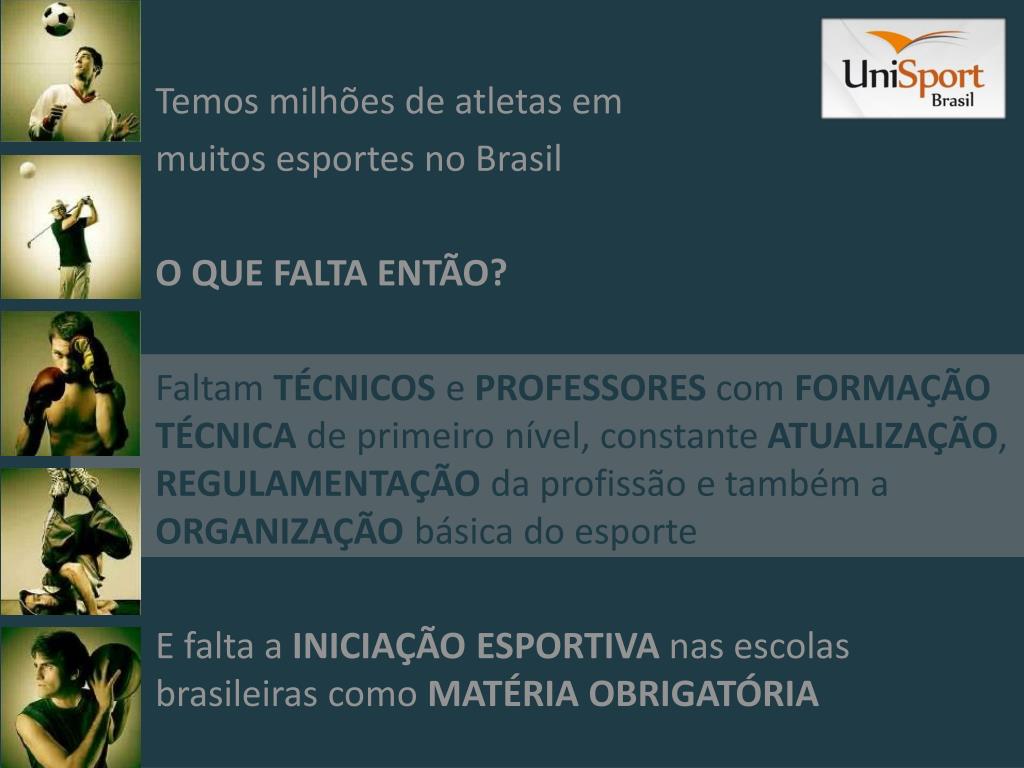 Temos milhões de atletas em muitos esportes no Brasil O QUE FALTA ENTÃO? Faltam TÉCNICOS e PROFESSORES com FORMAÇÃO TÉCNICA de primeiro nível, constante ATUALIZAÇÃO, REGULAMENTAÇÃO da profissão e também a ORGANIZAÇÃO básica do esporte E falta a INICIAÇÃO ESPORTIVA nas escolas brasileiras como MATÉRIA OBRIGATÓRIA