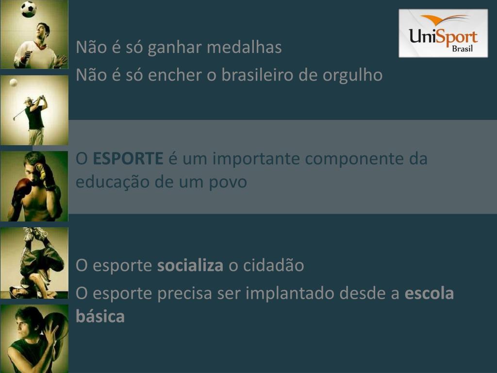 Não é só ganhar medalhas Não é só encher o brasileiro de orgulho O ESPORTE é um importante componente da educação de um povo O esporte socializa o cidadão O esporte precisa ser implantado desde a escola básica