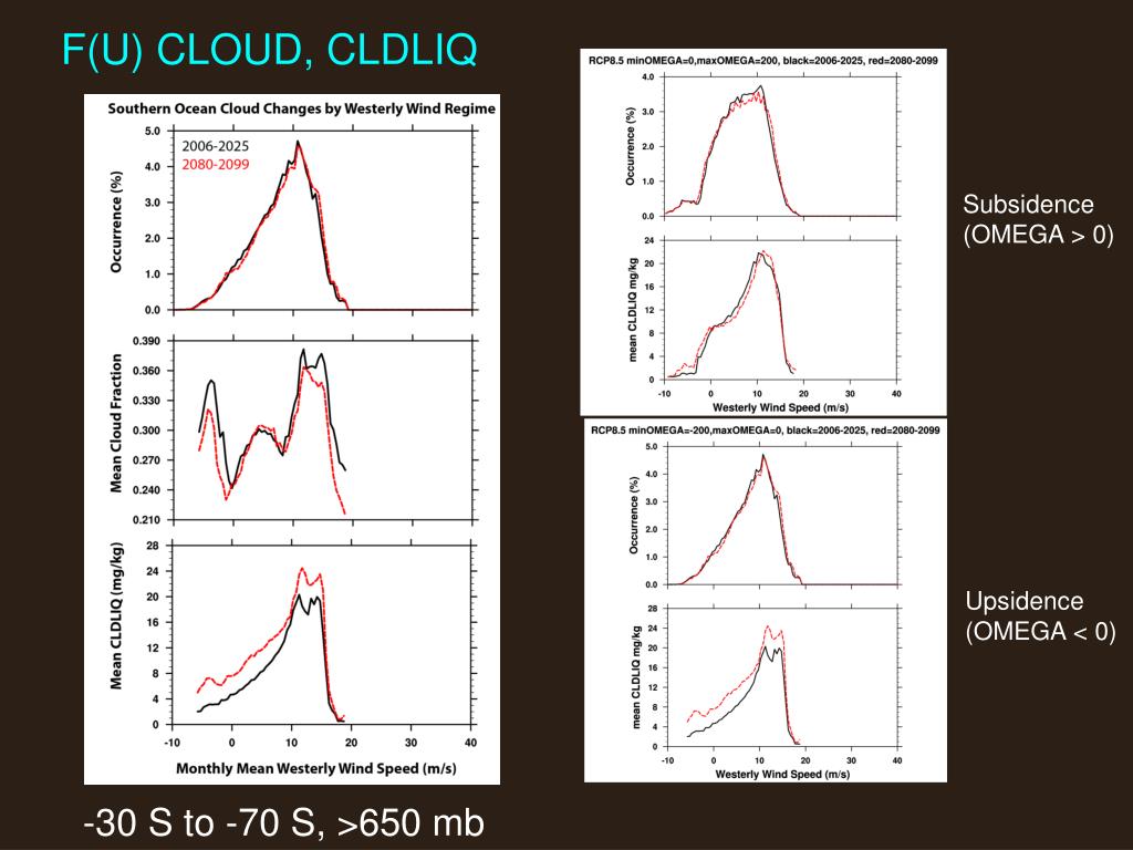 F(U) CLOUD, CLDLIQ Subsidence (OMEGA > 0) Upsidence (OMEGA < 0) -30 S to -70 S, >650 mb