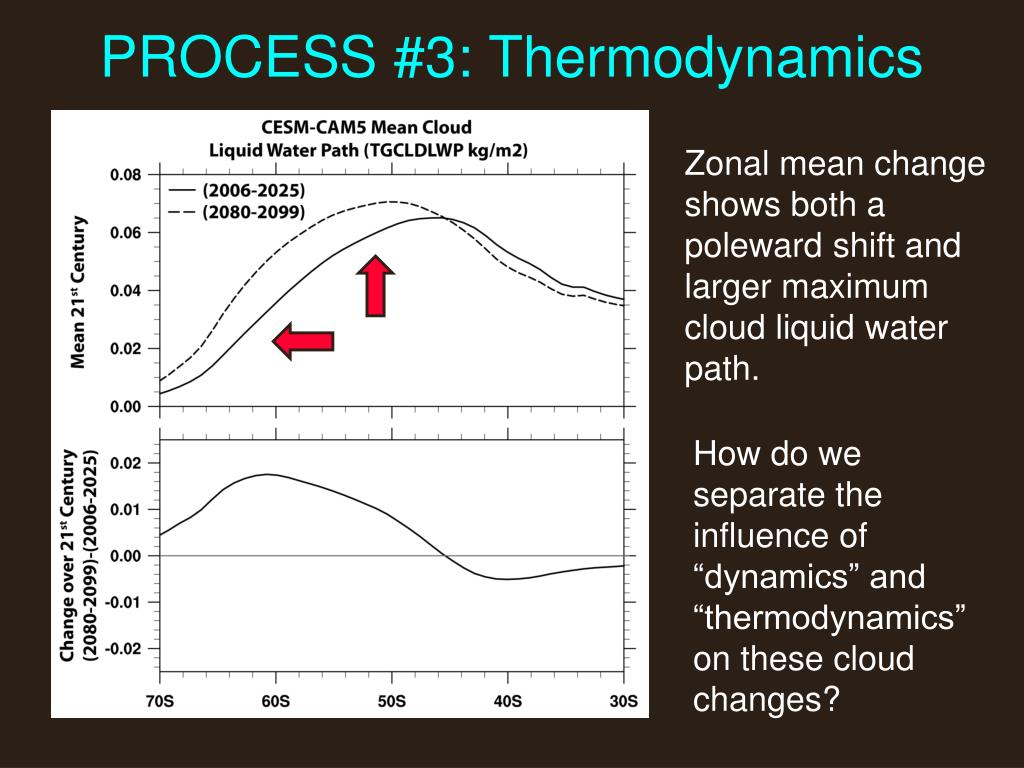 PROCESS #3: Thermodynamics Zonal mean change shows both a poleward shift and larger maximum cloud liquid water path. How do we separate the influence of “dynamics” and “thermodynamics” on these cloud changes?