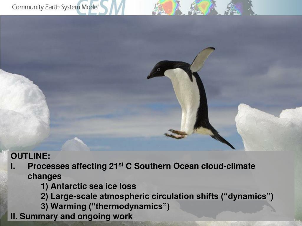 OUTLINE: Processes affecting 21st C Southern Ocean cloud-climate changes 1) Antarctic sea ice loss 2) Large-scale atmospheric circulation shifts (“dynamics”) 3) Warming (“thermodynamics”) II. Summary and ongoing work