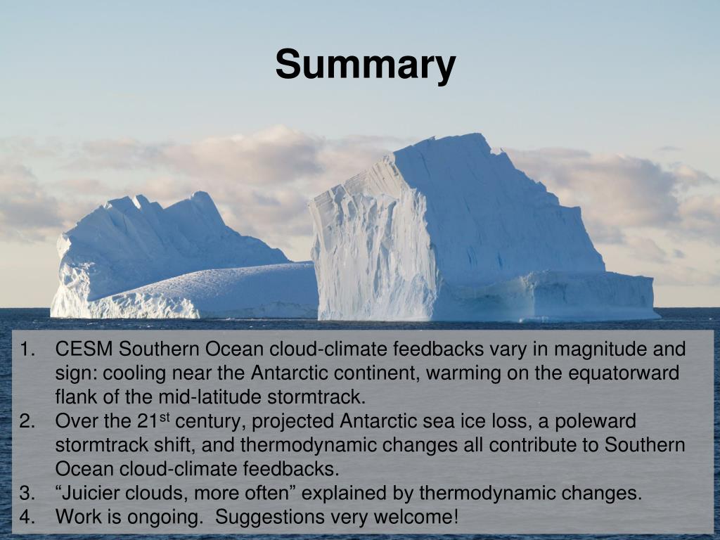 Summary CESM Southern Ocean cloud-climate feedbacks vary in magnitude and sign: cooling near the Antarctic continent, warming on the equatorward flank of the mid-latitude stormtrack. Over the 21st century, projected Antarctic sea ice loss, a polewardstormtrack shift, and thermodynamic changes all contribute to Southern Ocean cloud-climate feedbacks. “Juicier clouds, more often” explained by thermodynamic changes. Work is ongoing. Suggestions very welcome!