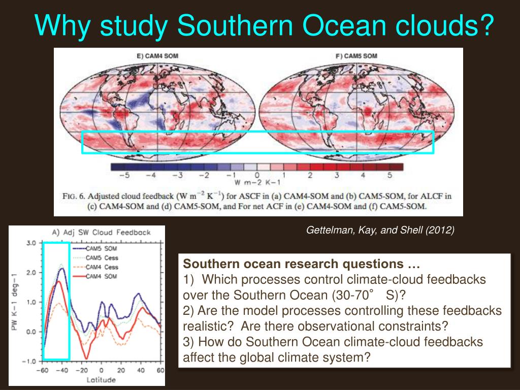 Why study Southern Ocean clouds? Gettelman, Kay, and Shell (2012) Southern ocean research questions … 1) Which processes control climate-cloud feedbacks over the Southern Ocean (30-70° S)? 2) Are the model processes controlling these feedbacks realistic? Are there observational constraints? 3) How do Southern Ocean climate-cloud feedbacks affect the global climate system?