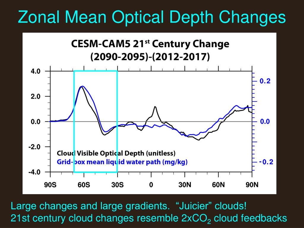 Zonal Mean Optical Depth Changes Large changes and large gradients. “Juicier” clouds! 21st century cloud changes resemble 2xCO2 cloud feedbacks