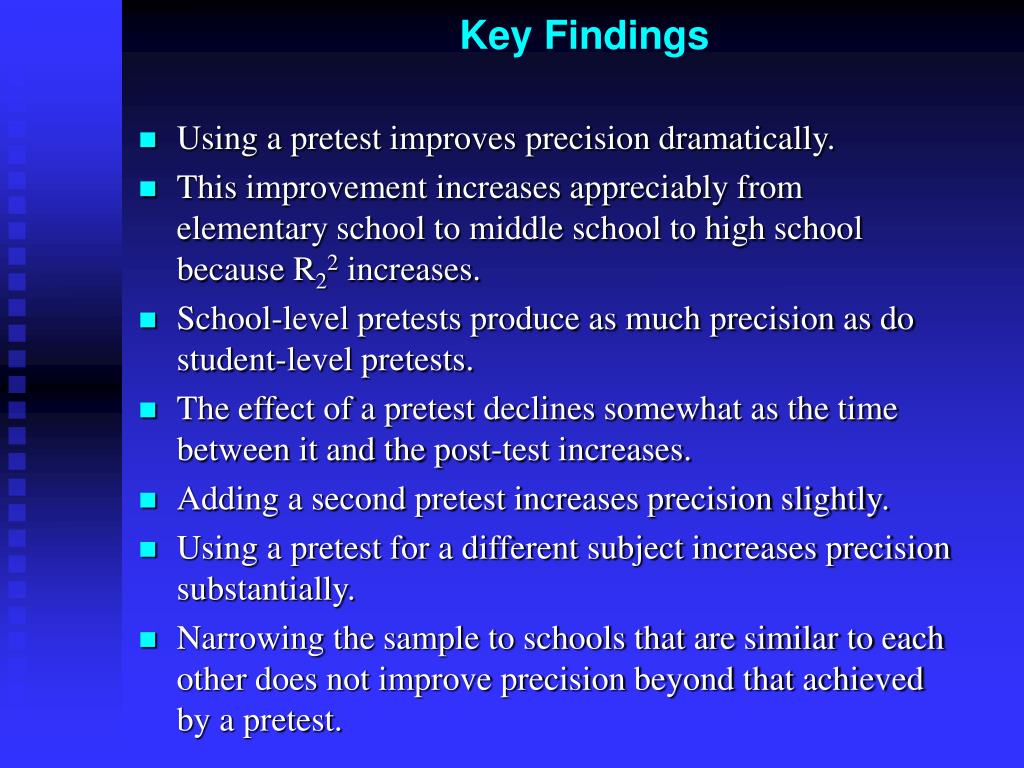 Key Findings • Using a pretest improves precision dramatically. • This improvement increases appreciably from elementary school to middle school to high school because R22 increases. • School-level pretests produce as much precision as do student-level pretests. • The effect of a pretest declines somewhat as the time between it and the post-test increases. • Adding a second pretest increases precision slightly. • Using a pretest for a different subject increases precision substantially. • Narrowing the sample to schools that are similar to each other does not improve precision beyond that achieved by a pretest.
