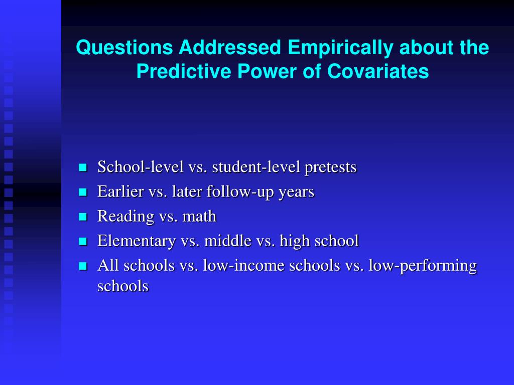 Questions Addressed Empirically about the Predictive Power of Covariates • School-level vs. student-level pretests • Earlier vs. later follow-up years • Reading vs. math • Elementary vs. middle vs. high school • All schools vs. low-income schools vs. low-performing schools