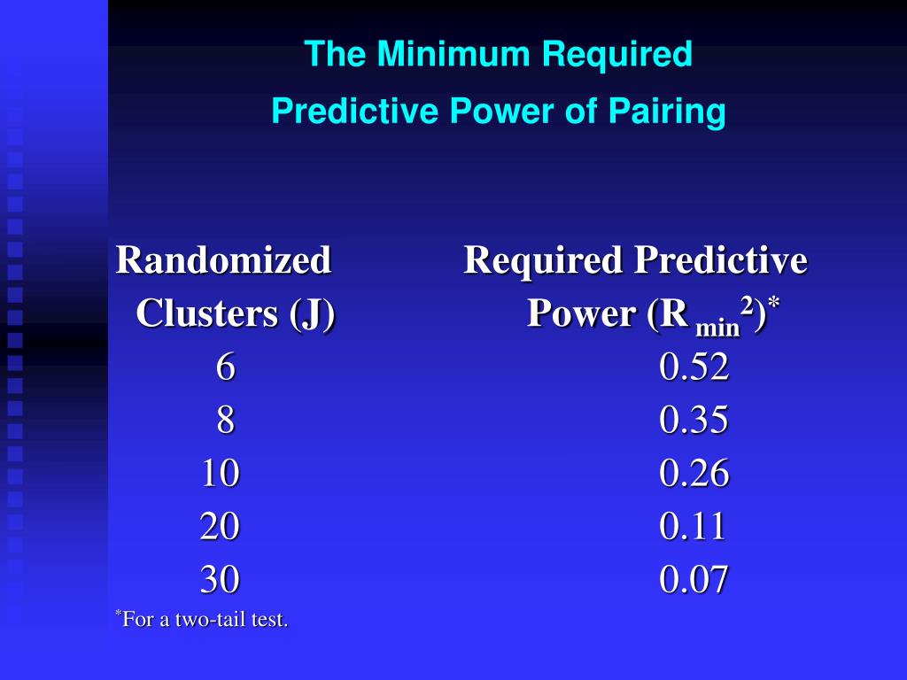 The Minimum Required Predictive Power of Pairing Randomized Required Predictive Clusters (J) Power (R min2)* 6 0.52 8 0.35 10 0.26 20 0.11 30 0.07 *For a two-tail test.