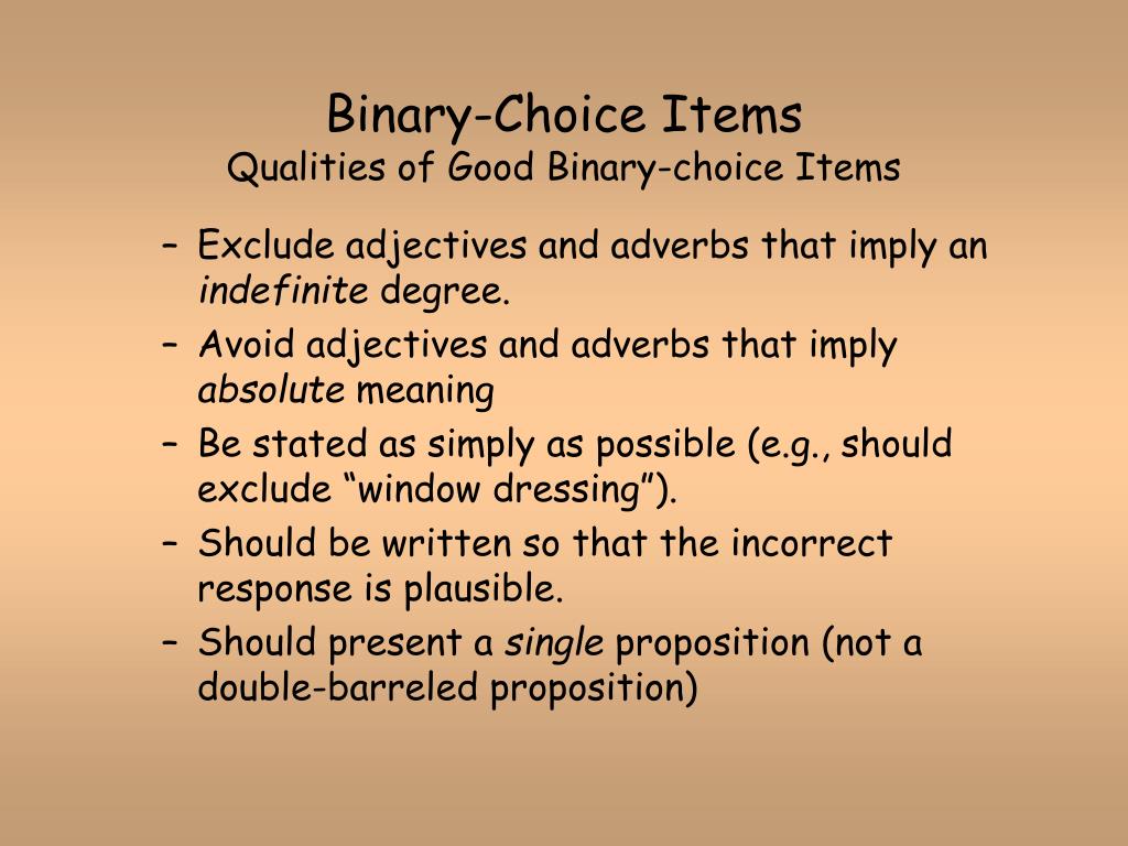 Binary-Choice ItemsQualities of Good Binary-choice Items • Exclude adjectives and adverbs that imply an indefinite degree. • Avoid adjectives and adverbs that imply absolute meaning • Be stated as simply as possible (e.g., should exclude “window dressing”). • Should be written so that the incorrect response is plausible. • Should present a single proposition (not a double-barreled proposition)