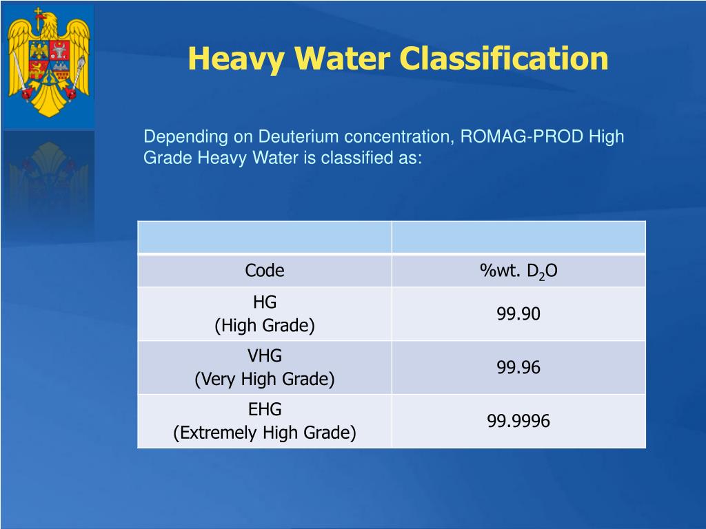 High Grade Heavy Water ROMAG-PROD Heavy Water Plant also produces high grade heavy water of a concentration greater than 99.96%.