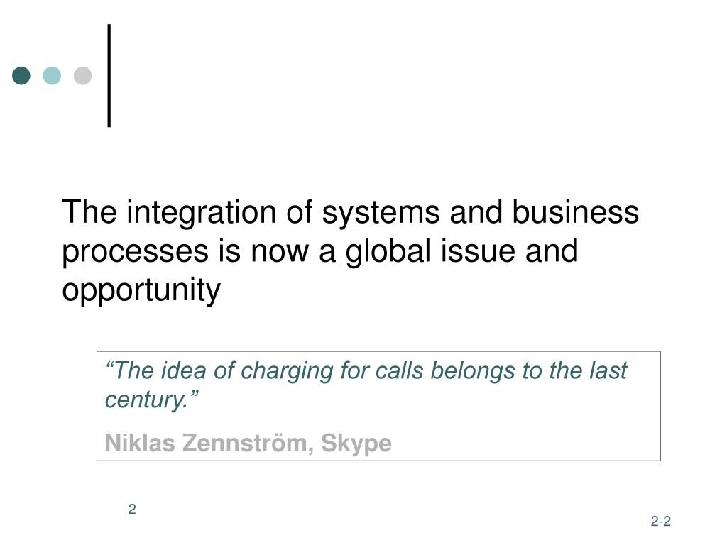 The integration of systems and business processes is now a global issue and opportunity “The idea of charging for calls belongs to the last century.” Niklas Zennström, Skype 2-2