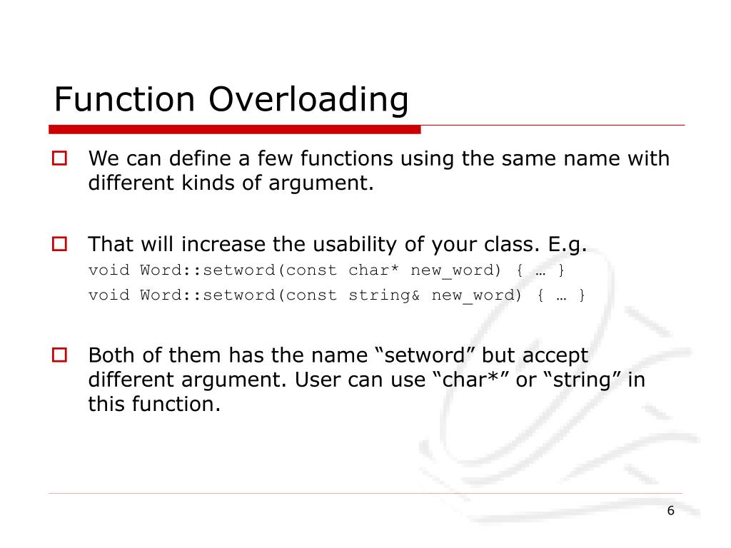 Function Overloading • We can define a few functions using the same name with different kinds of argument. • That will increase the usability of your class. E.g. void Word::setword(const char* new_word) { … } void Word::setword(const string& new_word) { … } • Both of them has the name “setword” but accept different argument. User can use “char*” or “string” in this function.