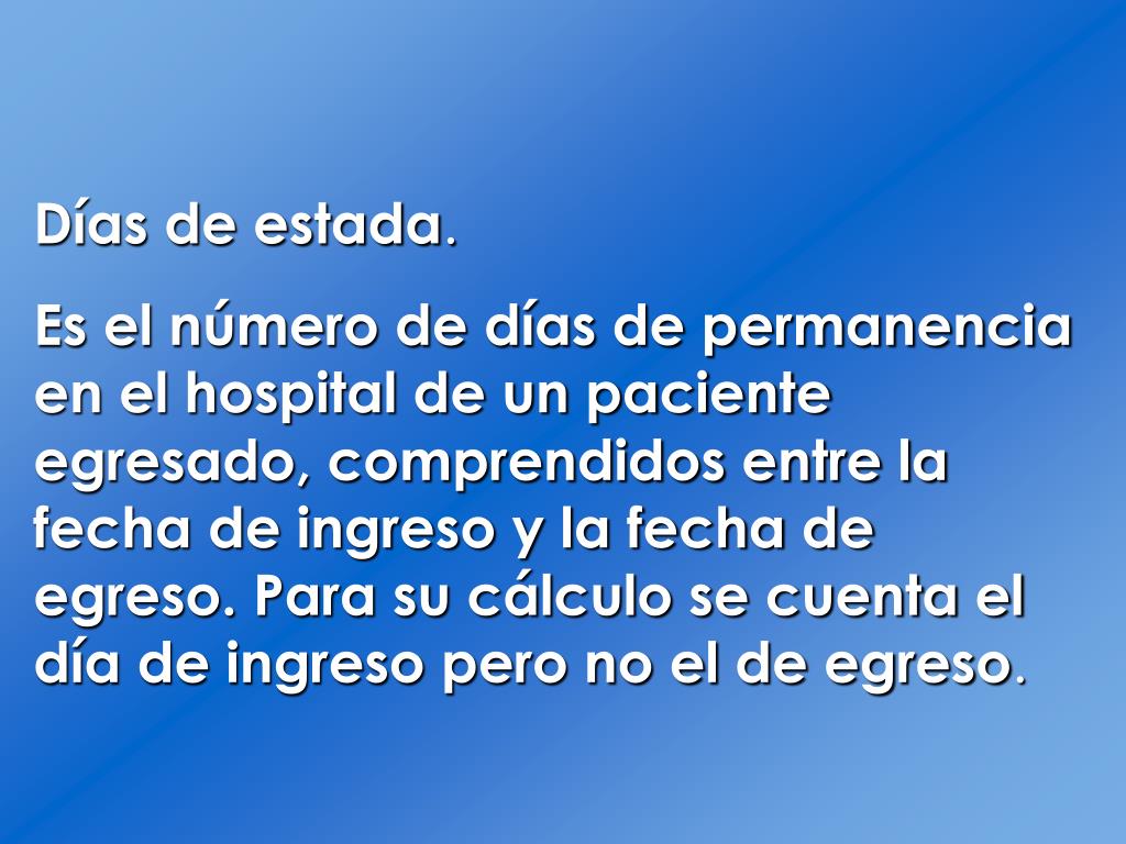 Días de estada. Es el número de días de permanencia en el hospital de un paciente egresado, comprendidos entre la fecha de ingreso y la fecha de egreso. Para su cálculo se cuenta el día de ingreso pero no el de egreso.
