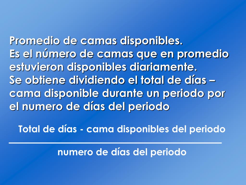 Promedio de camas disponibles. Es el número de camas que en promedio estuvieron disponibles diariamente. Se obtiene dividiendo el total de días – cama disponible durante un periodo por el numero de días del periodo Total de días - cama disponibles del periodo numero de días del periodo