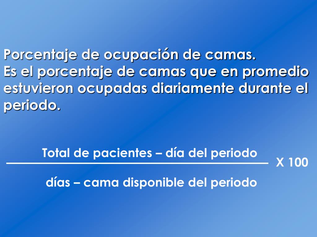 Porcentaje de ocupación de camas. Es el porcentaje de camas que en promedio estuvieron ocupadas diariamente durante el periodo. Total de pacientes – día del periodo días – cama disponible del periodo X 100
