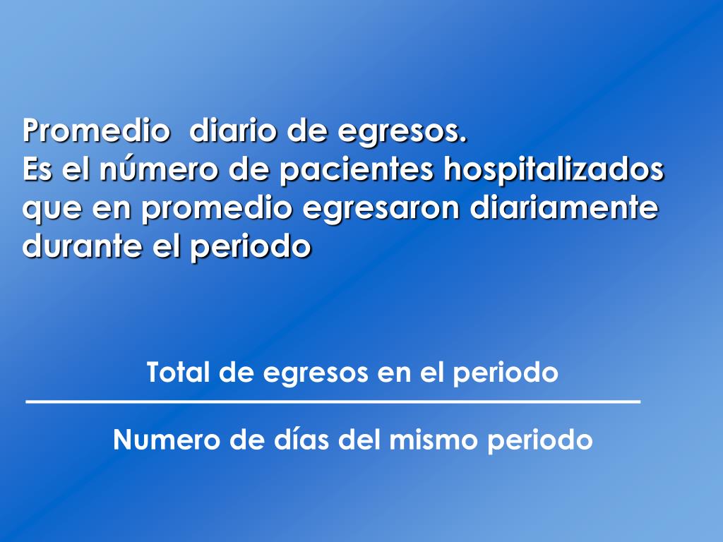 Promedio diario de egresos. Es el número de pacientes hospitalizados que en promedio egresaron diariamente durante el periodo Total de egresos en el periodo Numero de días del mismo periodo
