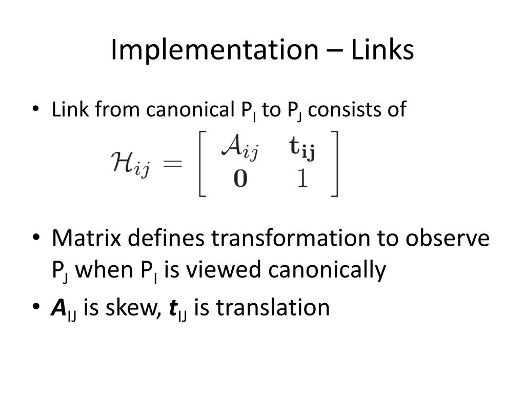 Implementation – Links • Link from canonical PI to PJ consists of • Matrix defines transformation to observe PJ when PI is viewed canonically • AIJ is skew, tIJ is translation