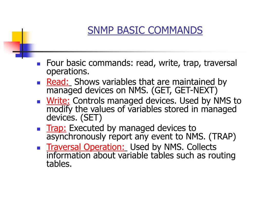 SNMP BASIC COMMANDS • Four basic commands: read, write, trap, traversal operations. • Read: Shows variables that are maintained by managed devices on NMS. (GET, GET-NEXT) • Write: Controls managed devices. Used by NMS to modify the values of variables stored in managed devices. (SET) • Trap: Executed by managed devices to asynchronously report any event to NMS. (TRAP) • Traversal Operation: Used by NMS. Collects information about variable tables such as routing tables.