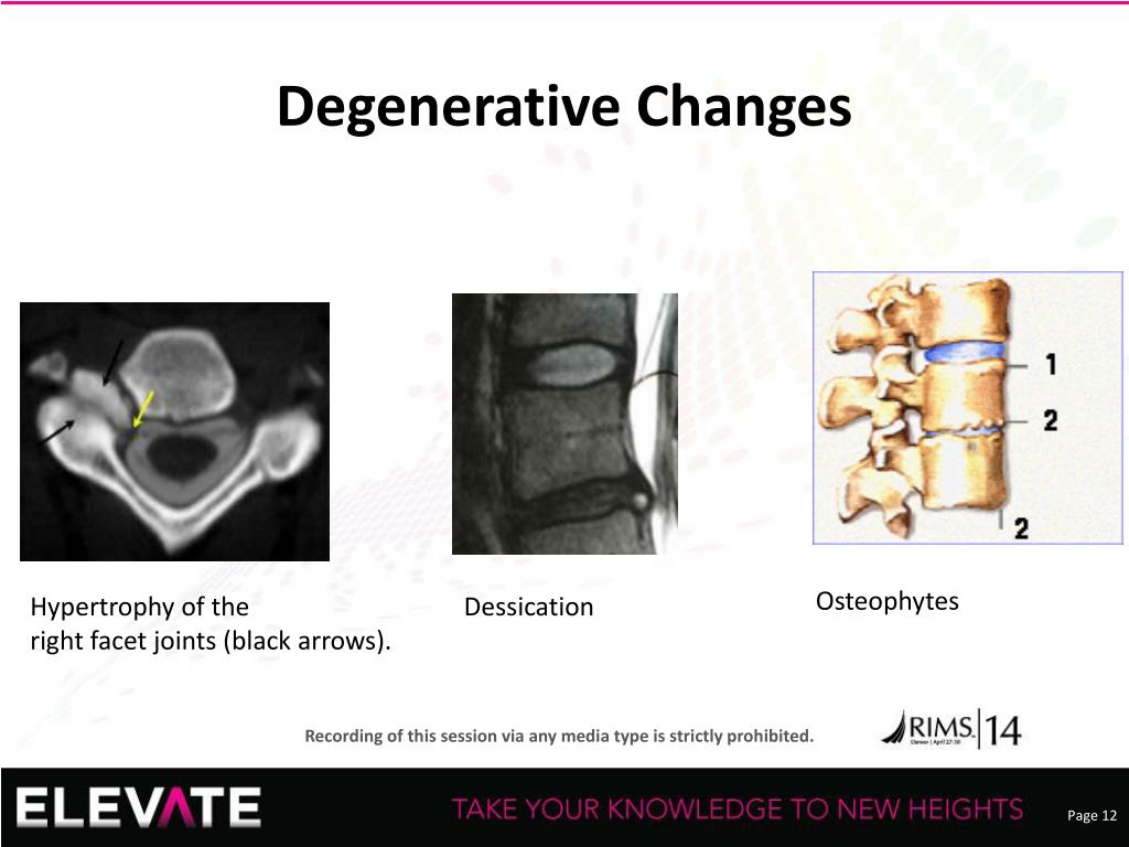 Degenerative Changes • Osteophytes • Hypertrophy of the • right facet joints (black arrows). • Dessication