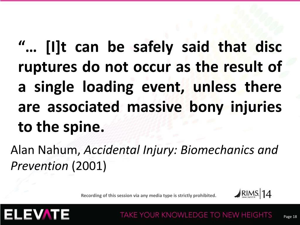 “… [I]t can be safely said that disc ruptures do not occur as the result of a single loading event, unless there are associated massive bony injuries to the spine. • Alan Nahum, Accidental Injury: Biomechanics and Prevention (2001)