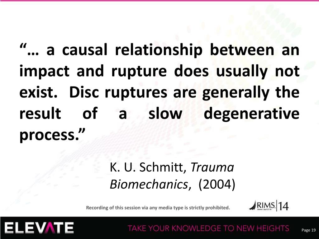 “… a causal relationship between an impact and rupture does usually not exist. Disc ruptures are generally the result of a slow degenerative process.” • K. U. Schmitt, Trauma Biomechanics, (2004)