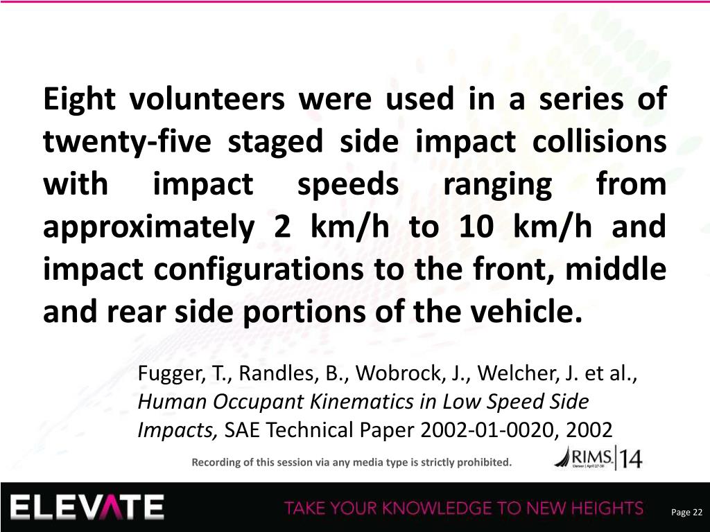 Eight volunteers were used in a series of twenty-five staged side impact collisions with impact speeds ranging from approximately 2 km/h to 10 km/h and impact configurations to the front, middle and rear side portions of the vehicle. • Fugger, T., Randles, B., Wobrock, J., Welcher, J. et al., Human Occupant Kinematics in Low Speed Side Impacts, SAE Technical Paper 2002-01-0020, 2002