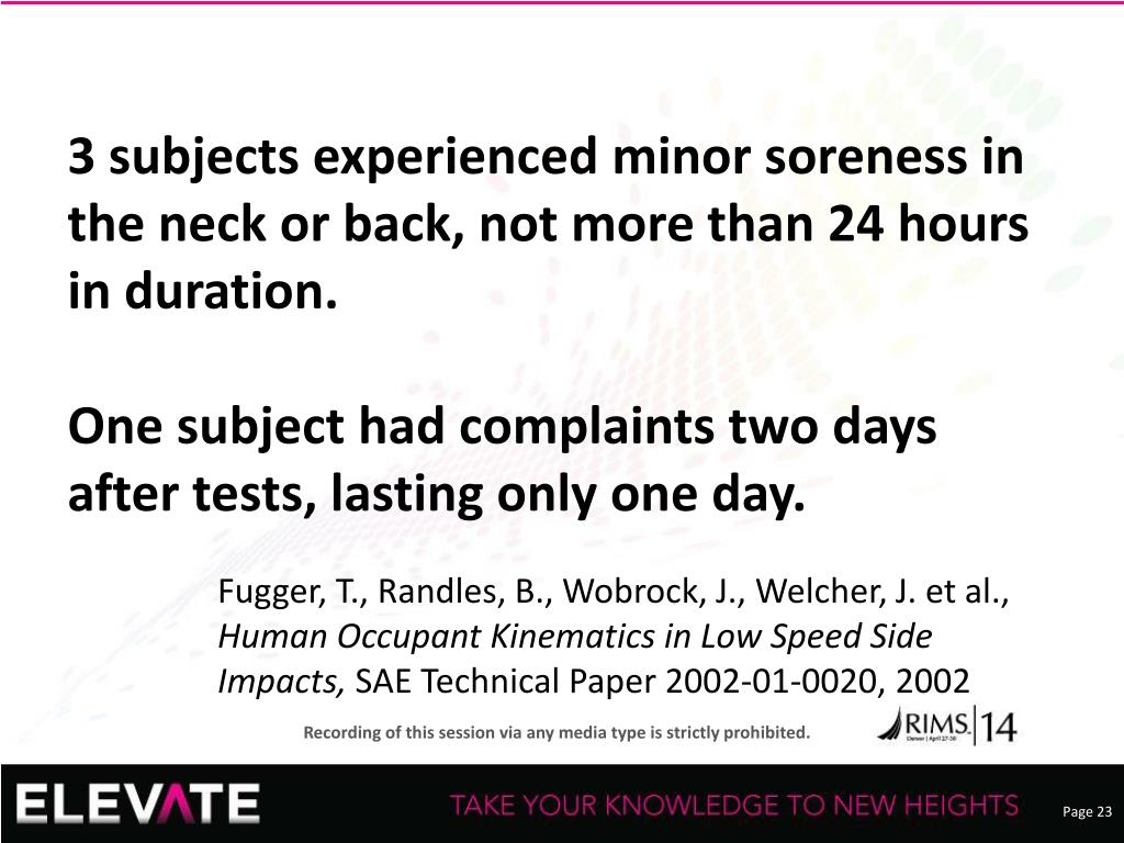 3 subjects experienced minor soreness in the neck or back, not more than 24 hours in duration.One subject had complaints two days after tests, lasting only one day. • Fugger, T., Randles, B., Wobrock, J., Welcher, J. et al., Human Occupant Kinematics in Low Speed Side Impacts, SAE Technical Paper 2002-01-0020, 2002