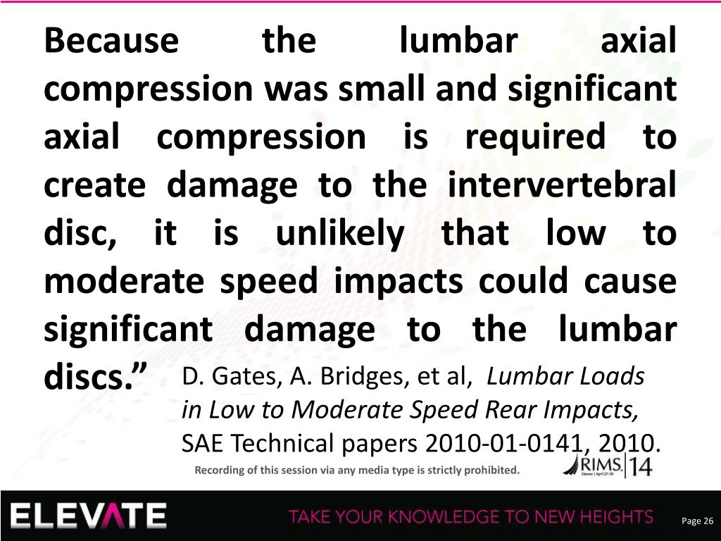Because the lumbar axial compression was small and significant axial compression is required to create damage to the intervertebral disc, it is unlikely that low to moderate speed impacts could cause significant damage to the lumbar discs.” • D. Gates, A. Bridges, et al, Lumbar Loads in Low to Moderate Speed Rear Impacts, SAE Technical papers 2010-01-0141, 2010.