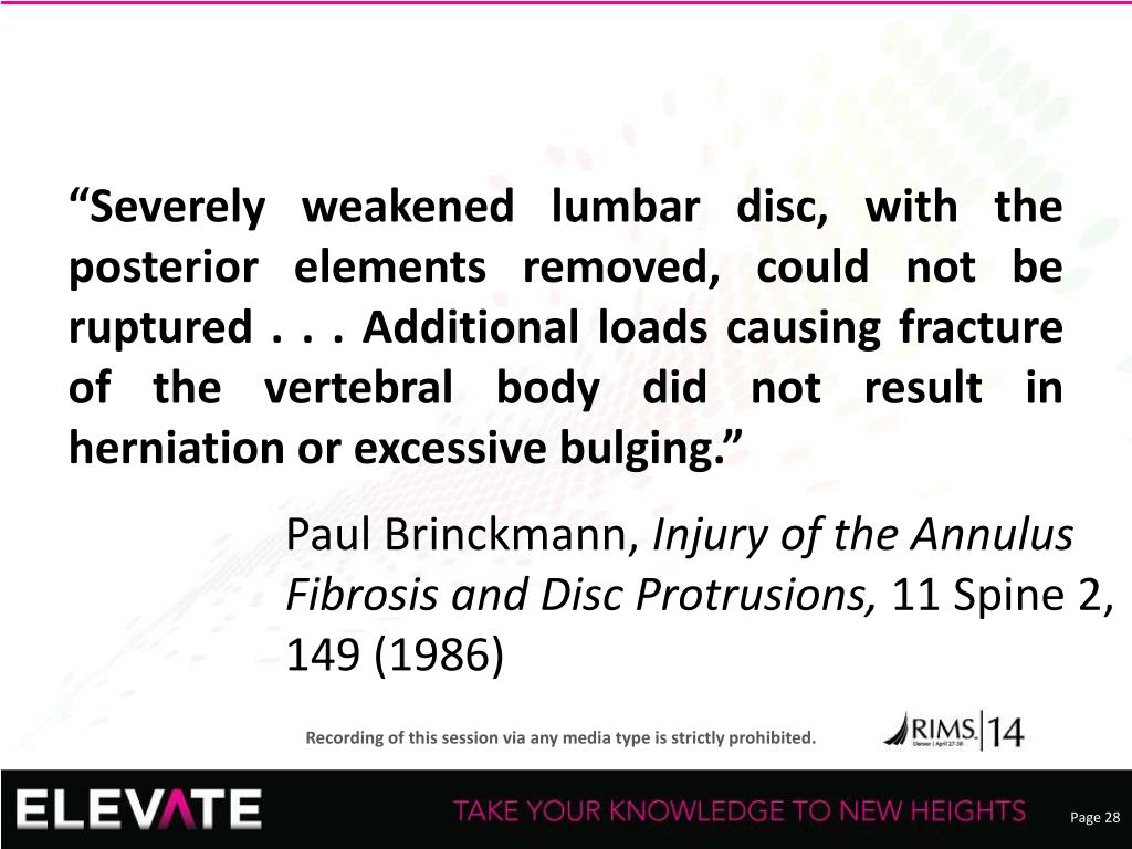 “Severely weakened lumbar disc, with the posterior elements removed, could not be ruptured . . . Additional loads causing fracture of the vertebral body did not result in herniation or excessive bulging.” • Paul Brinckmann, Injury of the Annulus Fibrosis and Disc Protrusions, 11 Spine 2, 149 (1986)