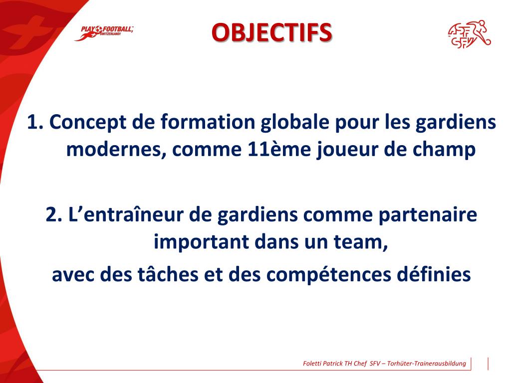 FORMATION D’ENTRAINEUR GARDIEN ASF. Foletti Patrick TH Chef SFV – Torhüter-Trainerausbildung. OBJECTIFS. 1. Concept de formation globale pour les gardiens modernes, comme 11ème joueur de champ 2. L’entraîneur de gardiens comme p artenaire important dans un team ,