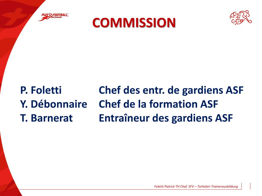COMMISSION P. Foletti Chef des entr. de gardiens ASF Y. Débonnaire Chef de la formation ASF T. Barnerat Entraîneur des gardiens ASF Foletti Patrick TH Chef SFV – Torhüter-Trainerausbildung
