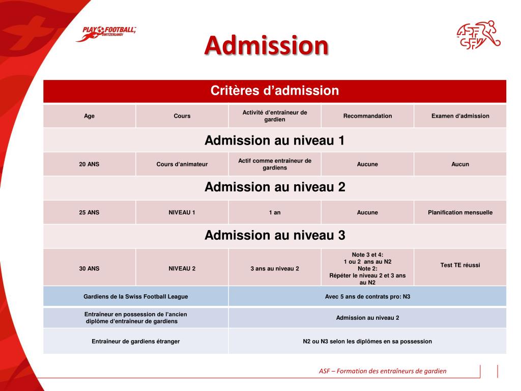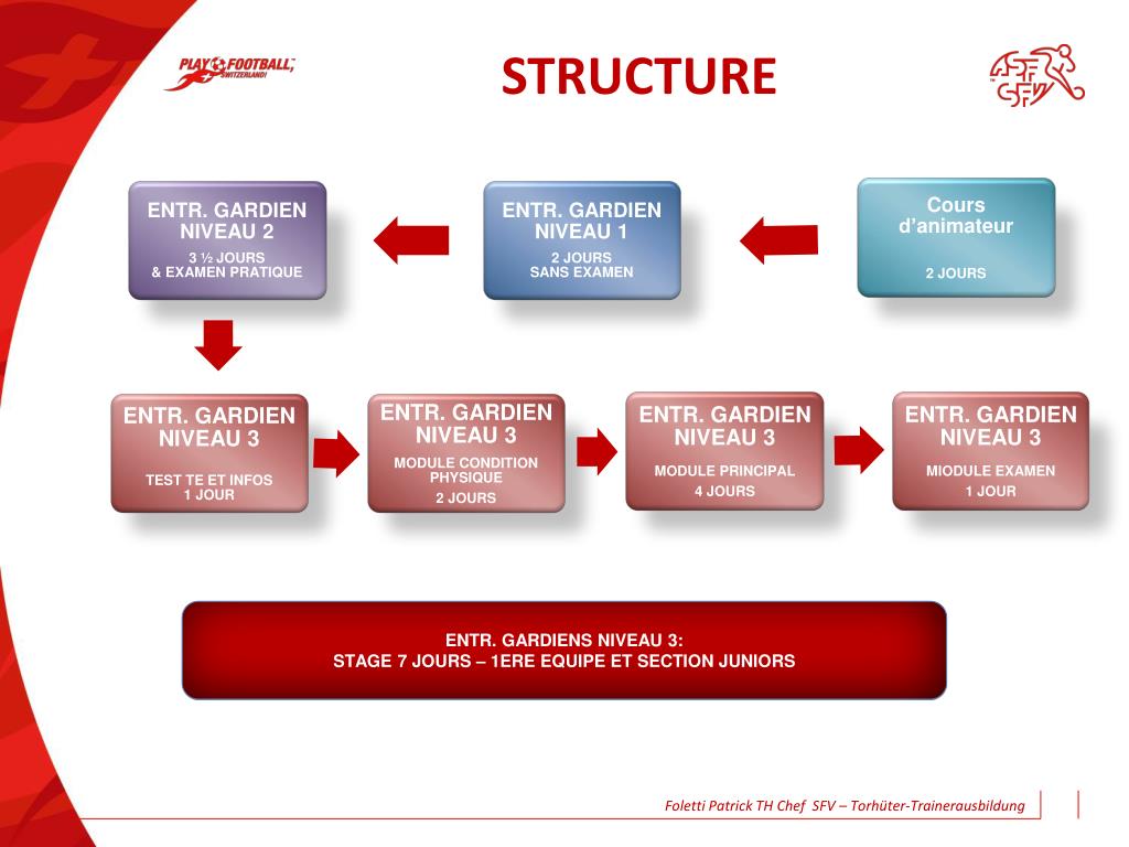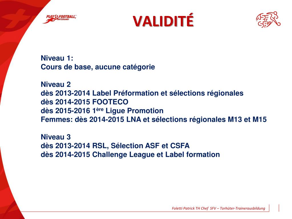 VALIDITÉ Niveau 1: Cours de base, aucune catégorie Niveau 2 dès 2013-2014 Label Préformation et sélections régionales dès 2014-2015 FOOTECO dès 2015-2016 1ère Ligue Promotion Femmes: dès 2014-2015 LNA et sélections régionales M13 et M15 Niveau 3 dès 2013-2014 RSL, Sélection ASF et CSFA dès 2014-2015 Challenge League et Label formation Foletti Patrick TH Chef SFV – Torhüter-Trainerausbildung