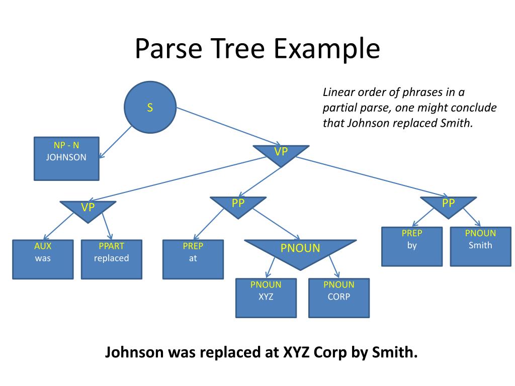 Parse Tree Example S Linear order of phrases in a partial parse, one might conclude that Johnson replaced Smith. NP - N JOHNSON VP PP PP VP PREP by PNOUN Smith AUX was PPART replaced PREP at PNOUN PNOUN XYZ PNOUN CORP Johnson was replaced at XYZ Corp by Smith.
