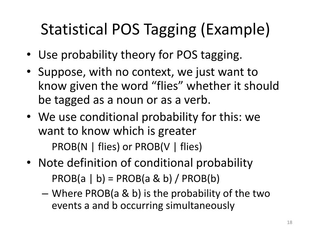 Statistical POS Tagging (Example) • Use probability theory for POS tagging. • Suppose, with no context, we just want to know given the word “flies” whether it should be tagged as a noun or as a verb. • We use conditional probability for this: we want to know which is greater PROB(N | flies) or PROB(V | flies) • Note definition of conditional probability PROB(a | b) = PROB(a & b) / PROB(b) • Where PROB(a & b) is the probability of the two events a and b occurring simultaneously