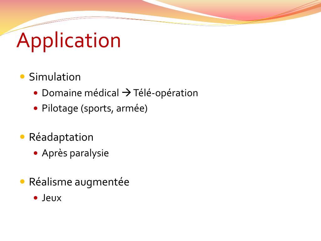 Application • Simulation • Domaine médical Télé-opération • Pilotage (sports, armée) • Réadaptation • Après paralysie • Réalisme augmentée • Jeux